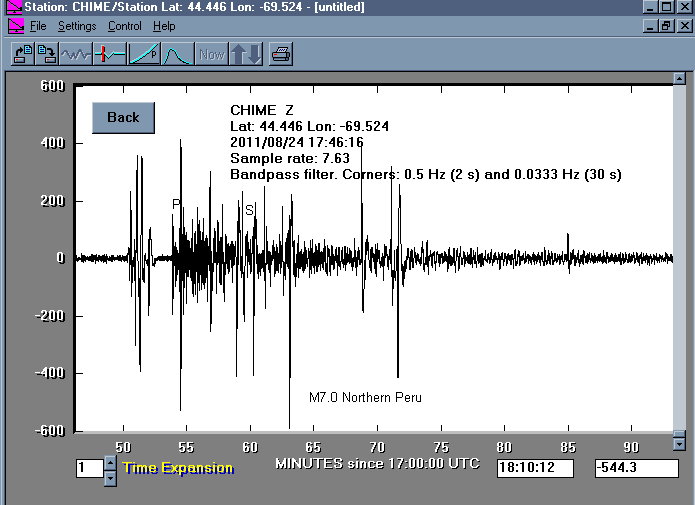 The P waves recorded with periods of about 2 to 5 seconds. Since the period of the seismometer is in this range, one questions what part of this signal is characteristic of the quake and what part is due to the seismometer. The S waves recorded with periods in the 6 second range. The surface waves, LQ and LR, recorded with periods of 8 to 24 seconds. The travel time calculation screen shows the quake was about 63 degrees from Maine.