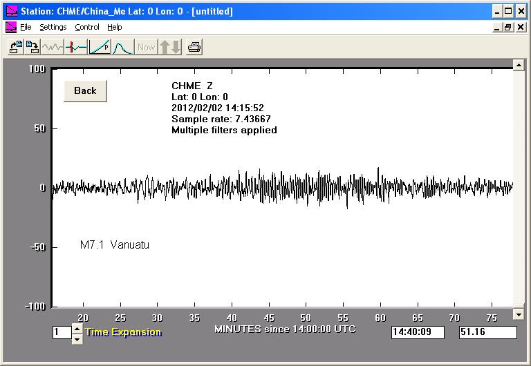 Earlier( below ) I discussed the tradeoffs of sensitivity and dynamic range and this quake shows just how quickly one approaches the high end of the dynamic range with a large quake. Most of the previous signals are displayed with a scale of +-100 and this quake is on a scale of +-1500.