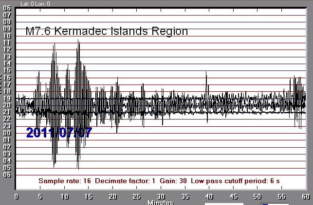 A major earthquake of M7.4 in the Kermadec Islands region of New Zealand. Shown is some early S waves arriving about 1825 followed by the LQ and LR surface waves at about 1850.