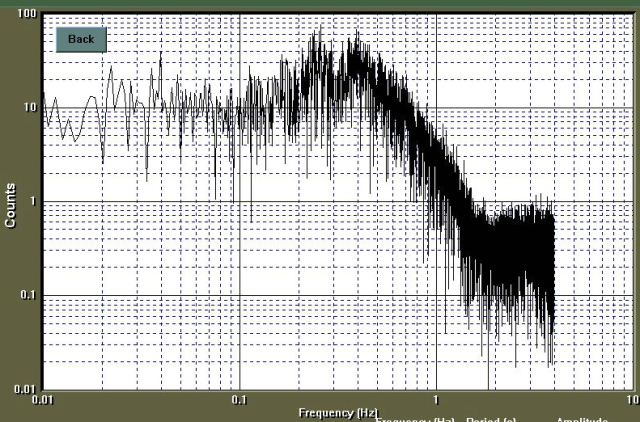 The frequency response shows the dip at 1.8 seconds caused by the FIR filtering and since the signal increases in the 2 to 3 hz range, I would think that currently we may be filtering too much. The analog filters roll off at 3 hz and it may have been interesting to see what this quake looked like with more high frequencys in the recording.