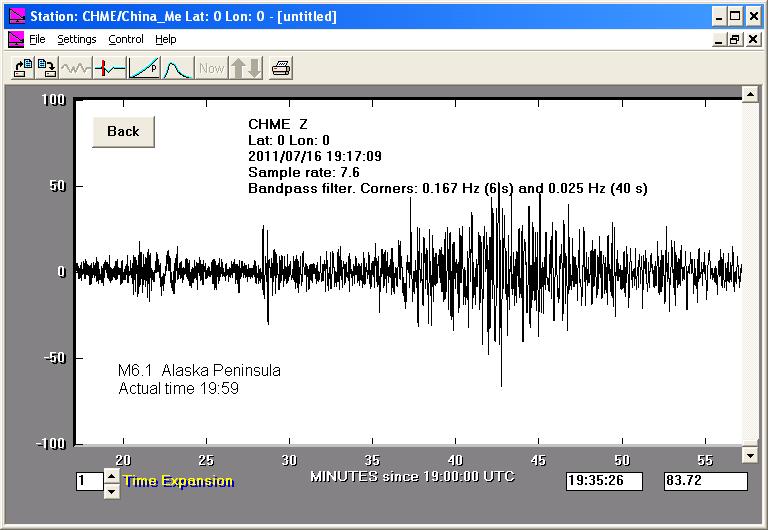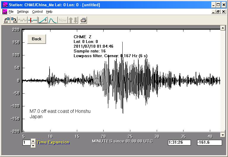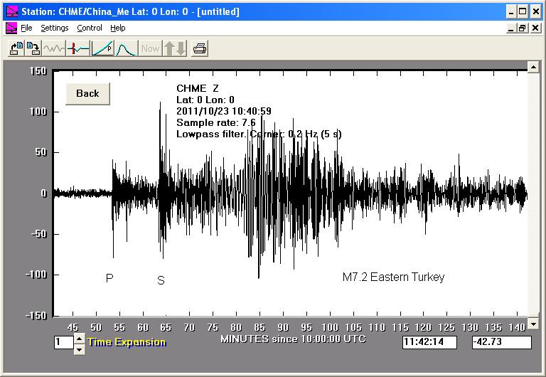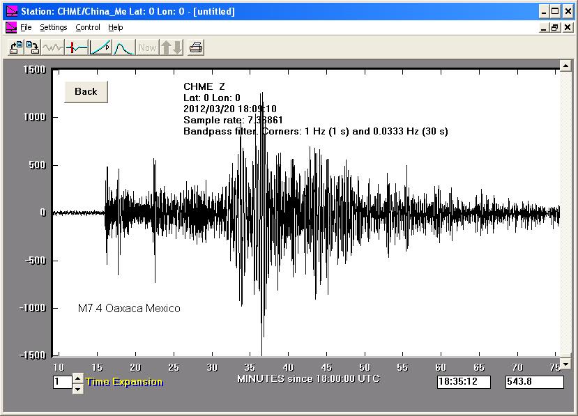 So the amplitude of the quake has increased over 10 times for quakes in the M6 range to one of M7.2. This seems correct as the scale is log base 10, so a M6 to M7 would be 10 times the signal. This quake also produced a quality recording and allows some analysis of the recording using some of the features of the amaseis program.