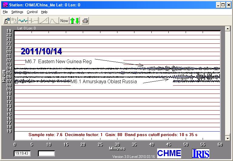 The station recorded two distant earthquakes today. A M6.7 at 3:35 UTC in Papua New Guinea and a M6.1 at 6:10 UTC in Amurskaya Oblast, Russia. The Russian quake shut down an oil pipeline for a few hours.