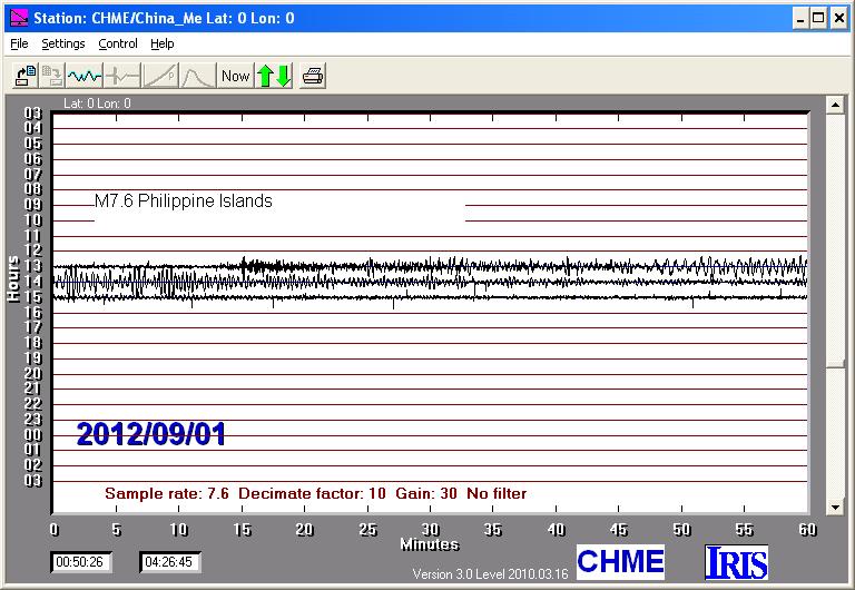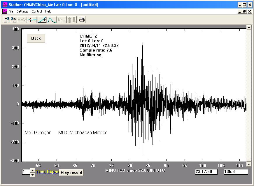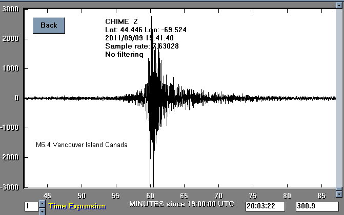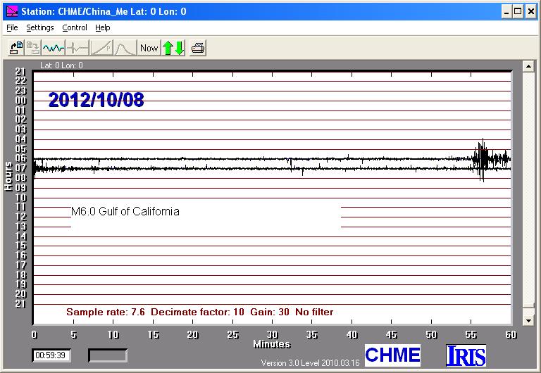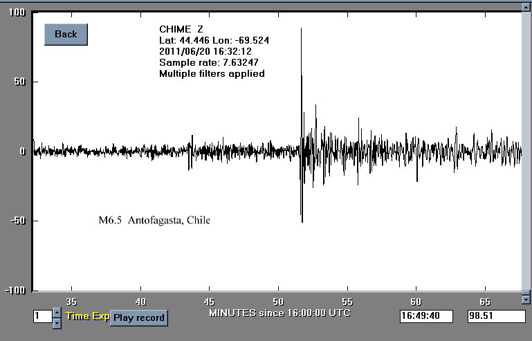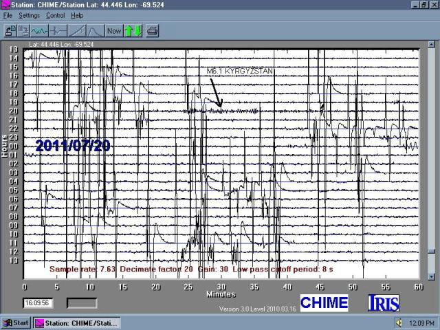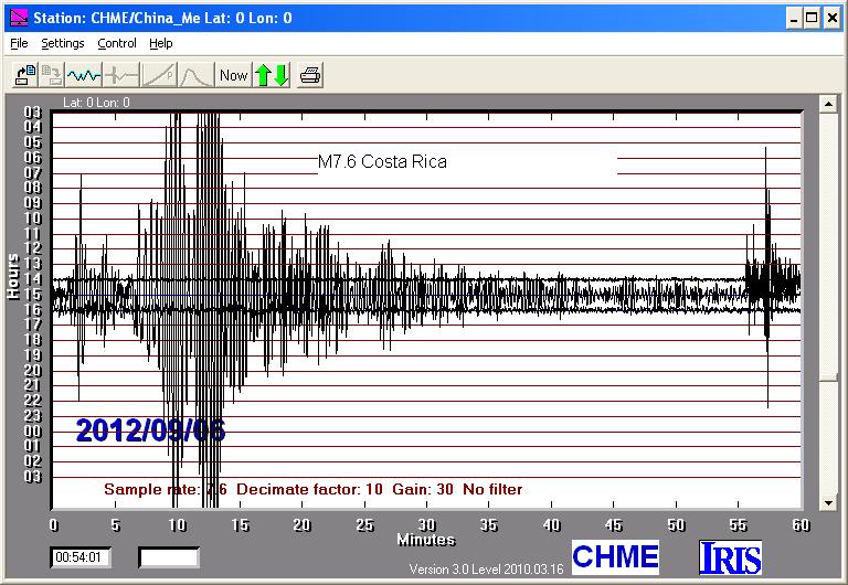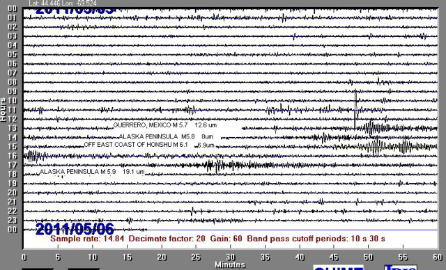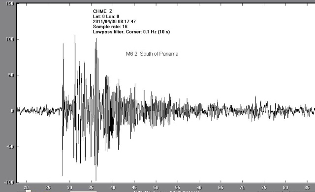 A magnitude 6.2 quake south of Panama. The signal was IIR filtered in my DSP starter kit for this recording. The DSK has a 14 bit A/D converter.