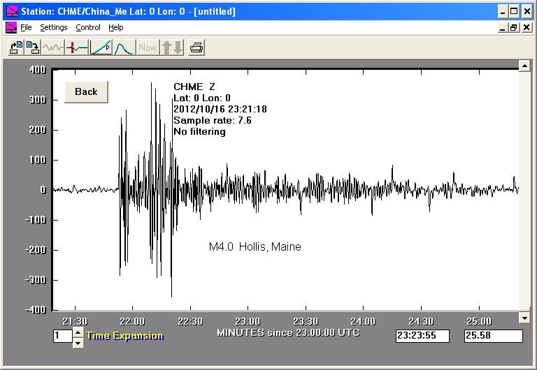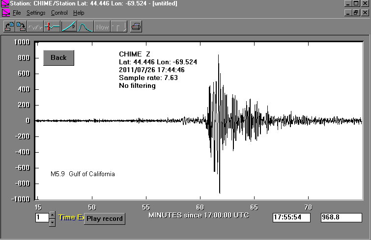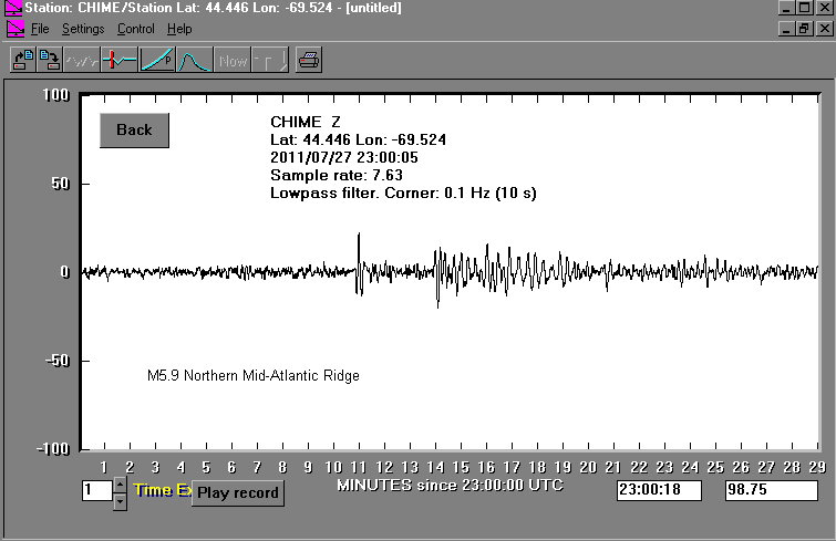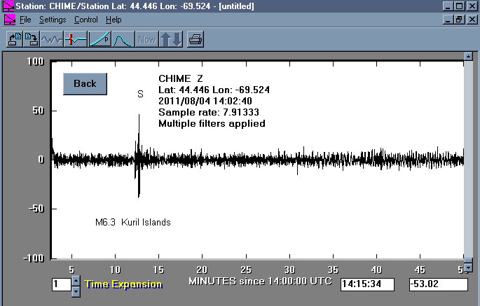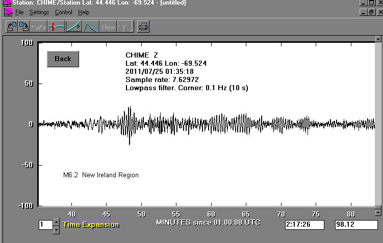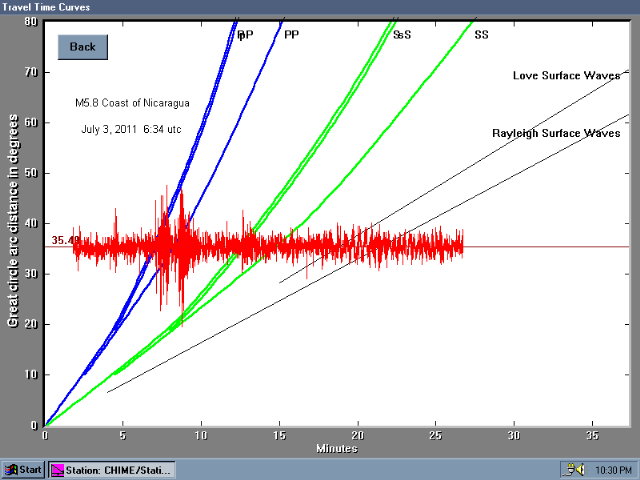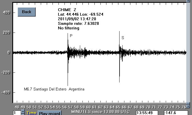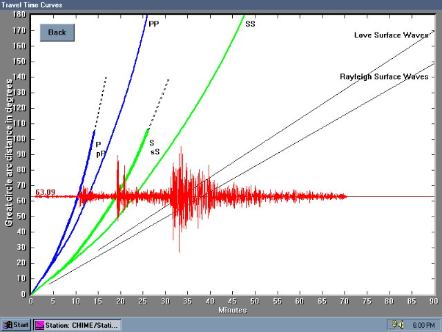 The P waves recorded with periods of about 2 to 5 seconds. Since the period of the seismometer is in this range, one questions what part of this signal is characteristic of the quake and what part is due to the seismometer. The S waves recorded with periods in the 6 second range. The surface waves, LQ and LR, recorded with periods of 8 to 24 seconds. The travel time calculation screen shows the quake was about 63 degrees from Maine.
