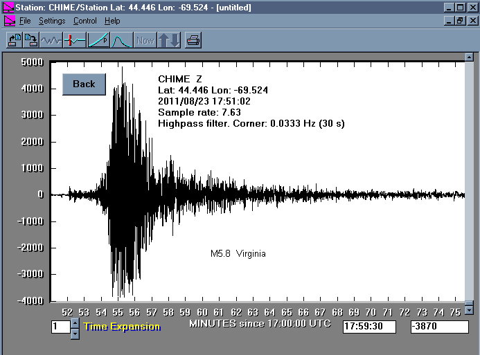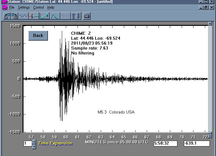 Today there were two unusual earthquakes in the USA. First was a M5.3 earthquake in Colorado. This was considered as a once in 40 years or so event. This earthquake was soon overshadowed in the news by a M5.8 earthquake in Virginia, and this earthquake was considered a once in 100 years or more event. Although these quakes are considered moderate, they are the closest quakes yet recorded at this station and produced large signals.