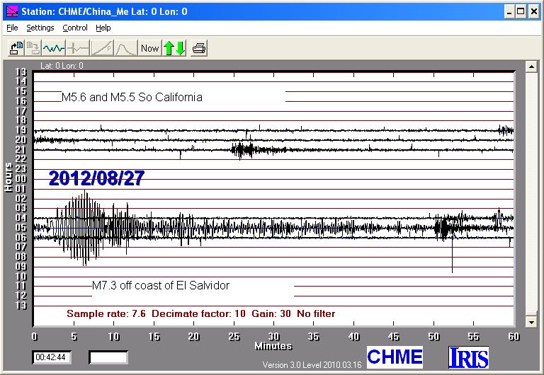 Near the coast of Nicaragua, there was a 5.8 quake on July 3rd. The short frequencies recorded well. This signal is shown unfiltered as filtering looses too much of the short P and S waves.