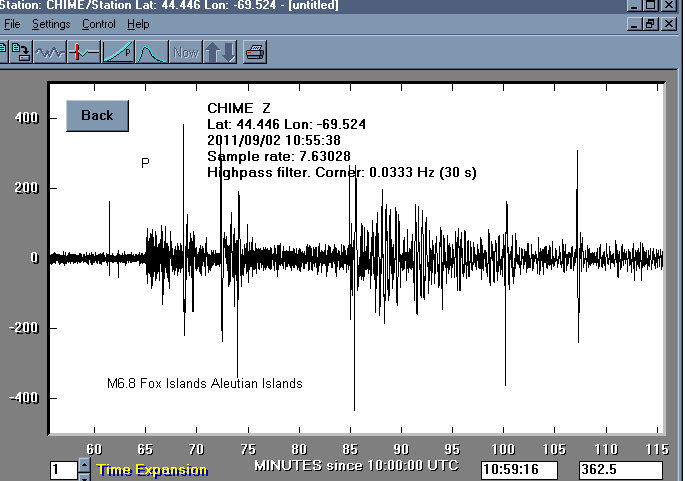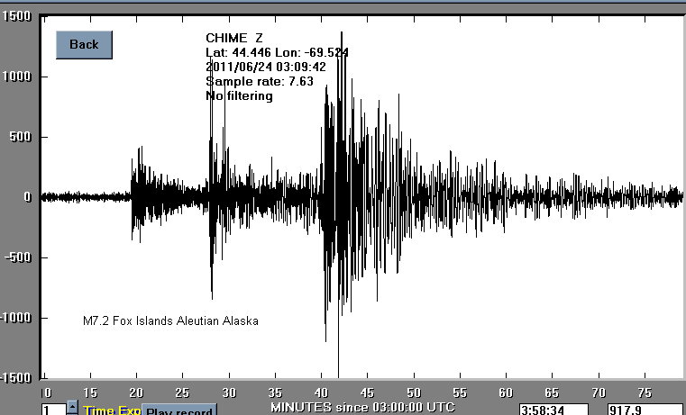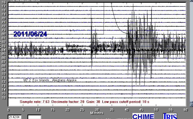 Another Fox Islands quake, this was originally classed as a 7.1 and downgraded to 6.8. The 1 hz FIR filter has been removed as discussed below which should help with recording P wave signals from close earthquakes.
