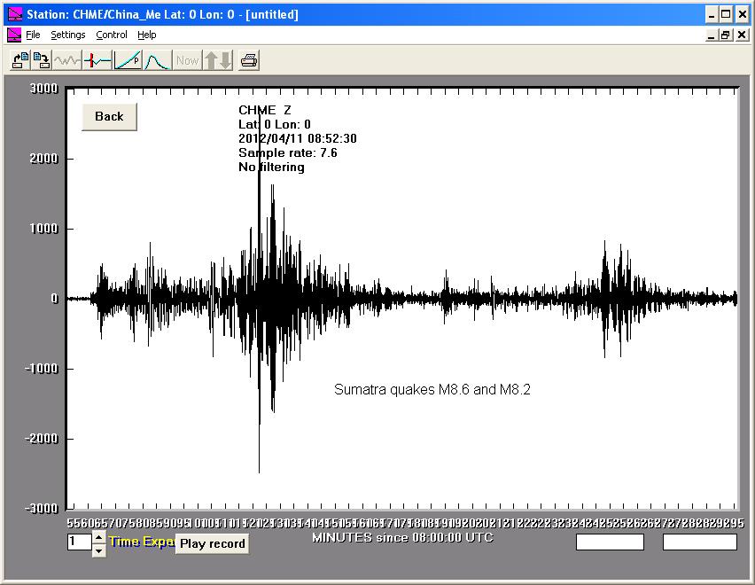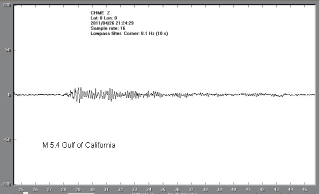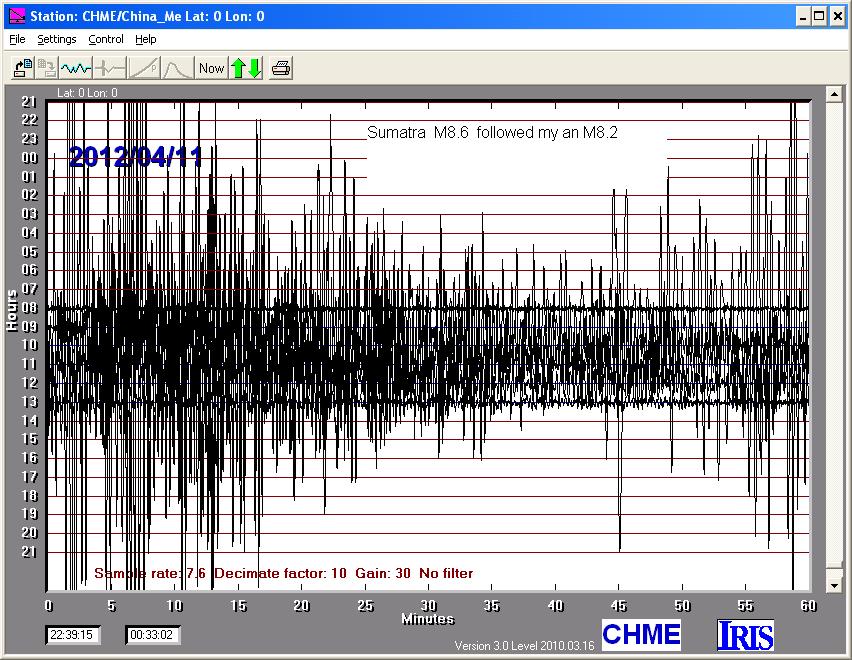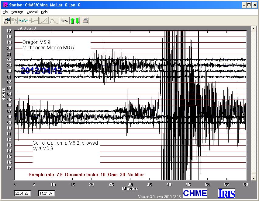The past 24 hours has seen several very large earthquakes. There was a M8.6 quake off the coast of Sumatra followed by a M8.2 quake two hours later. These were very large earthquakes. Then 10 hours later there was a M5.9 quake off the coast of Oregon and 15 minutes later a M6.5 quake at Michoacan, Mexico. Eight hours later there were two quakes in the Gulf of California, Baha Mexico, a M6.2 and 10 minutes later a M6.9. The recording of the last quake exceeded the 13 bit dynamic range of the system being used.
