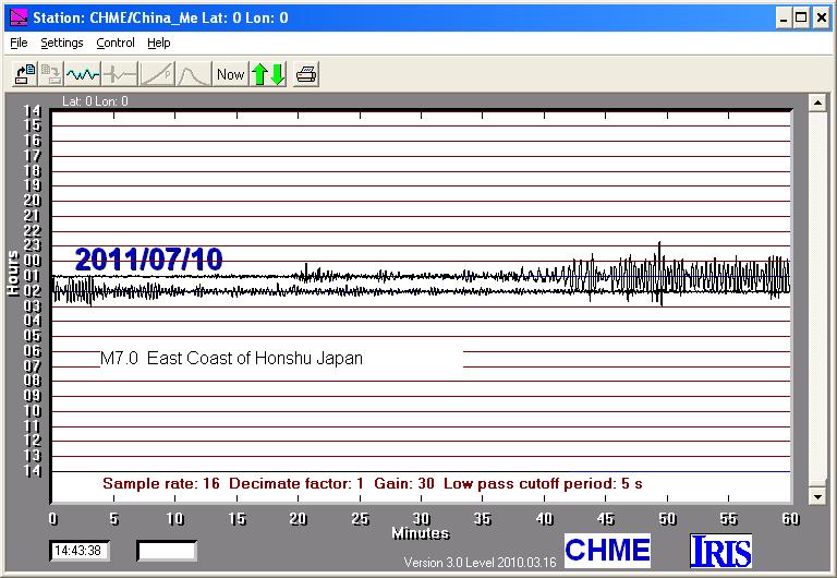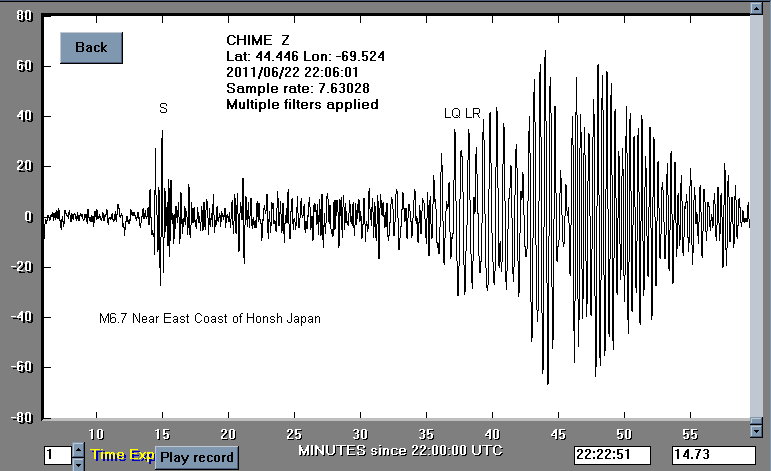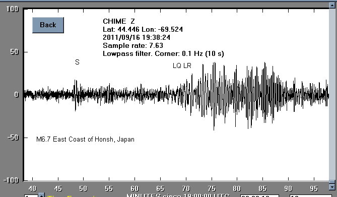 A M6.7 earthquake near Honshu Japan made the news today as the 75th aftershock of magnitude 6 or larger since the 9.0 earthquake. The recording has a good record of the S waves and the LQ LR surface waves. The P waves are down in the noise.