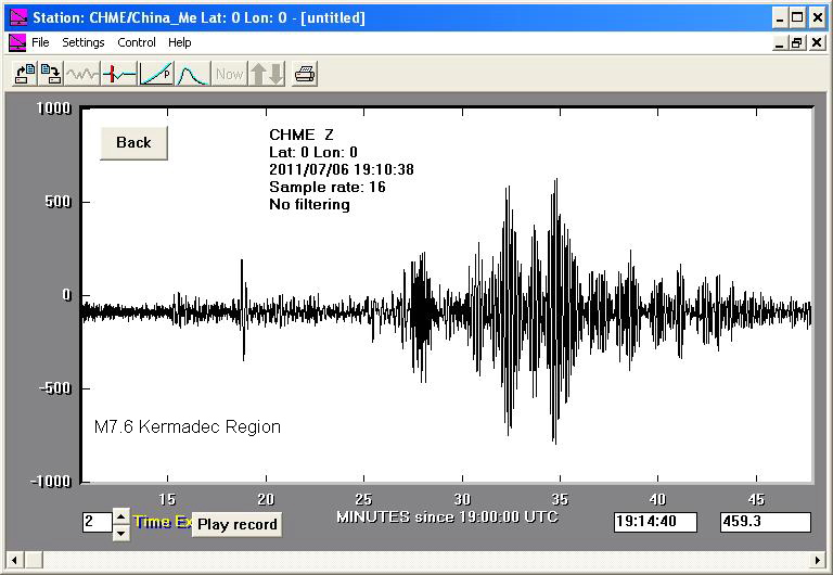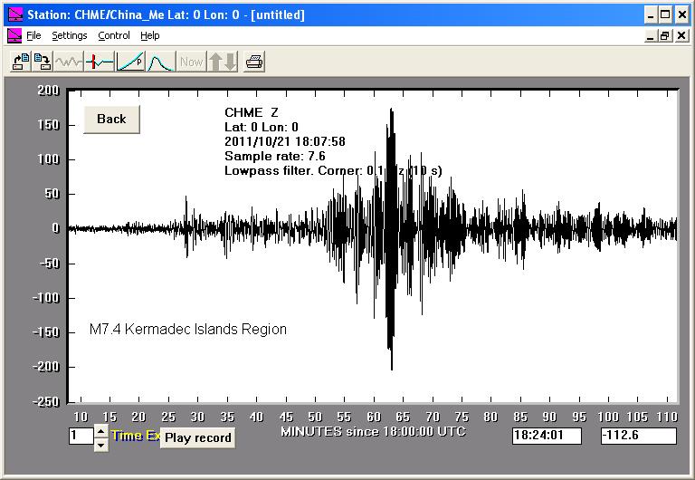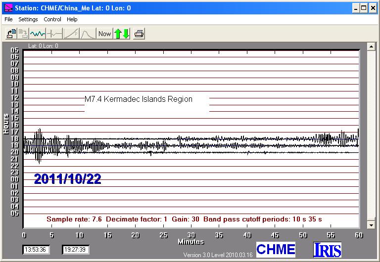 A major earthquake of M7.4 in the Kermadec Islands region of New Zealand. Shown is some early S waves arriving about 1825 followed by the LQ and LR surface waves at about 1850.
