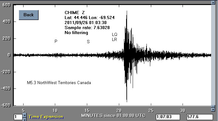 A M5.3 in Northwest Territories Canada. This relatively close quake( 36.9 deg) was very shallow. Not much was recorded of the P and S waves, but the surface waves produced a large signal.