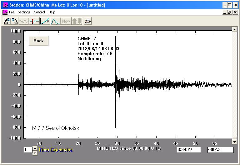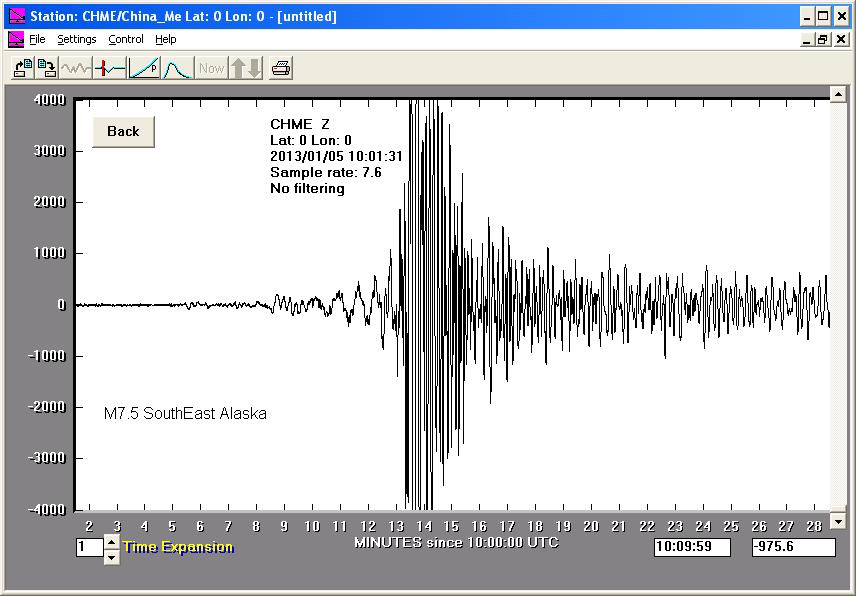 Earlier( below ) I discussed the tradeoffs of sensitivity and dynamic range and this quake shows just how quickly one approaches the high end of the dynamic range with a large quake. Most of the previous signals are displayed with a scale of +-100 and this quake is on a scale of +-1500.