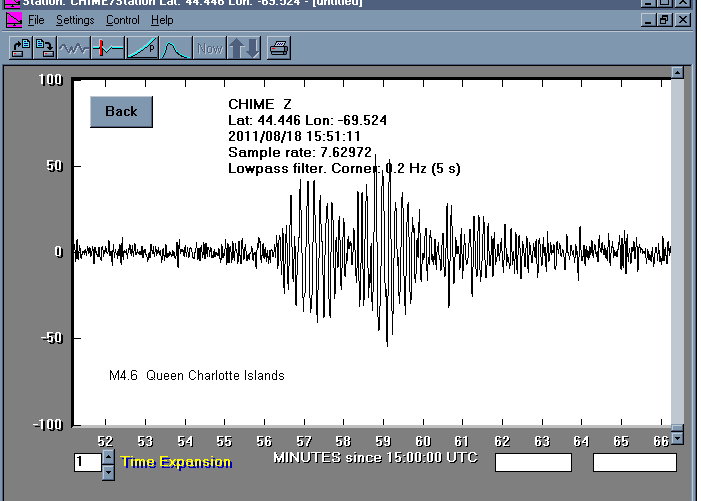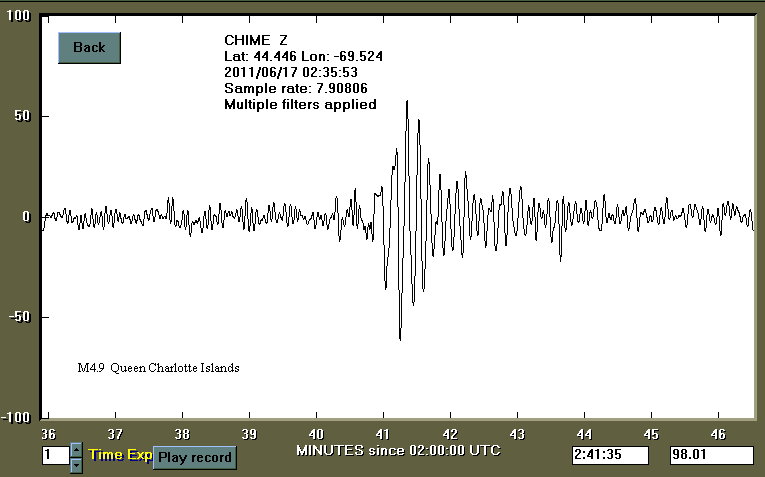 A Queen Charlotte Islands M4.9 earthquake on the West Coast. A short burst of surface waves arrived about 20 minutes after the quake.