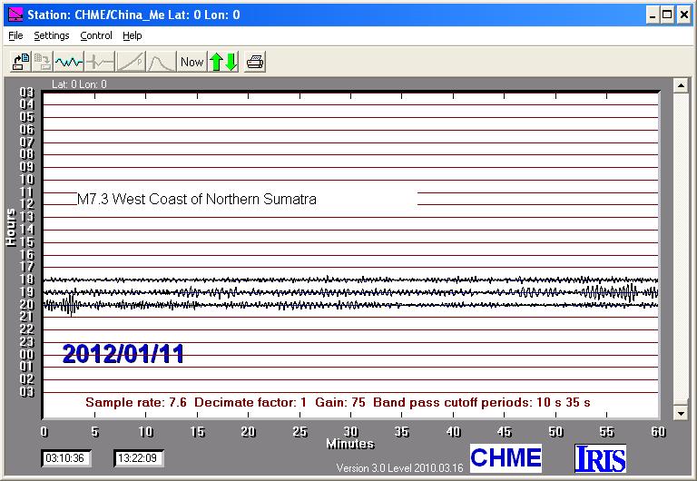 An M7.3 earthquake of the West coast of Northern Sumatra produced some surface waves. The seismometer is picking up more noise since I moved it to a new location in the basement. Some more work is needed to isolate it from drafts.