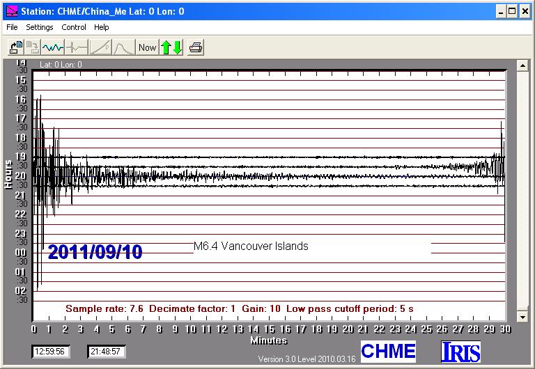 M6.4 earthquake on Vancouver Island. The surface waves produced a very large signal on the east coast. There were no early reports of damage.