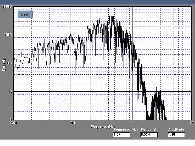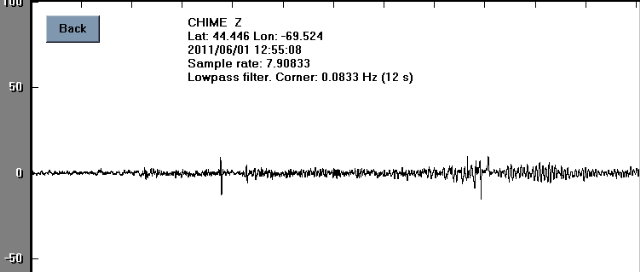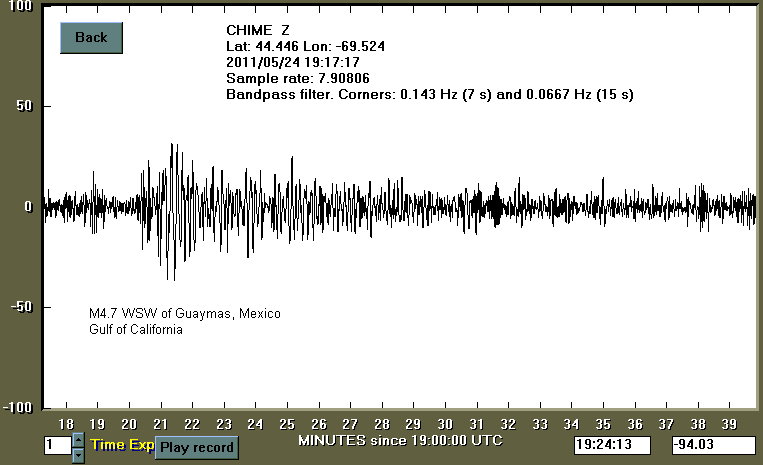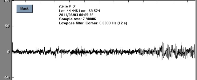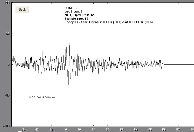 This signal appears to be PP waves from a 4.7 Gulf of California earthquake. Since it was not listed in the list of worldwide quakes of 5.0 and larger, it took a bit of doing to find its location. The IRIS realtime online images were a big help as I could see by the timing of the signal on the stations around the country that it was closest to the Arizona stations. Most of the energy in this signal has a period around 10 seconds.