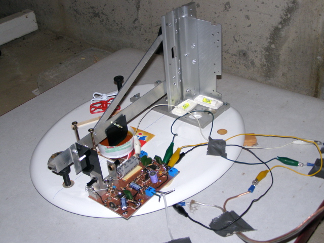 May 9 and May 10 - wired proto circuit onto copper and missed the Loyalty Islands earthquake. View of the wired circuit with the position sensor. The photo-transistor is in an opamp circuit that keeps the voltage across the transistor constant. It never enters cutoff or saturation. Then there is a low pass filter with a gain of 5, followed by a highpass filter with a selection of two gains; 2 or 6.6. The last stage is a 2 pole unity gain lowpass filter.
